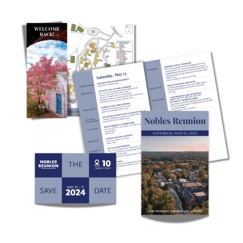 Nobles welcomes alumni, family, and friends back to campus throughout the year for reunions and other events. Professional, printed materials – from invitations to programs and handouts – play an important part in branding and event communication.
